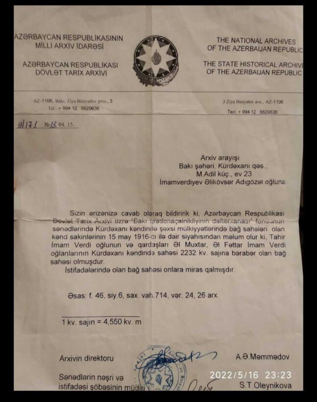 Vətəndaş bildirir ki, əlində Azərbaycan Milli Arxiv İdarəsindən çıxardığı sənəd var və həmin sənəddə torpağın babasına məxsus olduğu göstərilib: