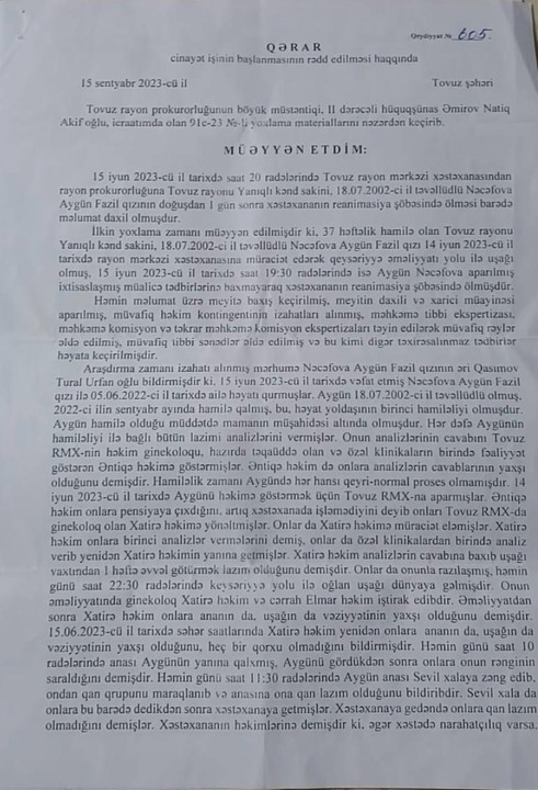 “Hamiləlik dövründə Əntiqə həkimin nəzarətində olmuşdu, heç bir problem də yox idi. İyunun 14-də doğuş üçün Tovuz Rayon Mərkəzi Xəstəxanasına getdik. Orada Xatirə həkim analizlərin cavabına baxdı. Dedi ki, “gəlin, qeysəriyyə əməliyyatı eləyək”. Bu əməliyyat da doğuş vaxtından bir həftə əvvəl olmalıdır. Elə həmin gün əməliyyat olunmasını təklif elədi, biz də razılaşdıq”.