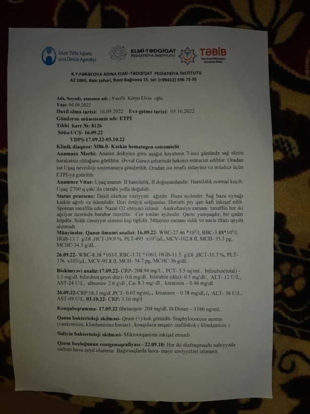 “Sanki kukla qoluydu, hərəkət etmirdi, toxunan kimi uşaq çığırırdı. Xəstəxanaya geri qaytardıq. Həkim dedi ki, doğuşda travma alıb. Ginekoloq isə uşağın tam sağlam doğulduğunu təsdiqlədi. Körpəni Bakıdakı Elmi-Tədqiqat Pediatriya İnstituna gətirdik, 21 gün xəstəxanada qaldı. Məlum oldu ki, infeksiya salıblar, iynədən sonra həmin yerə peyvənd də vurulub”,-Elvin Yusifli deyib.