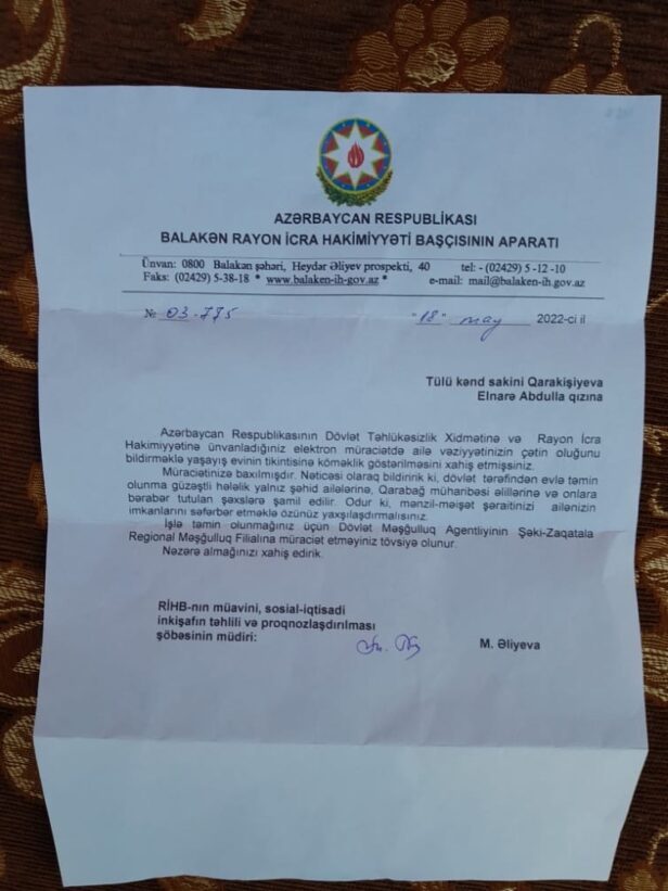 “Elnarə Qarakişiyeva quruma müraciət edib, ona həm rəsmi, həm də şifahi bildirilib ki, dövlət tərəfindən evlə təmin olunma güzəşti hələlik yalnız müharibə əlillərinə və şəhid ailələrinə şamil olunur. İşlə təmin olunma məsələsinə gəlincə, ailə üzvləri Dövlət Məşğulluq Agentliyinin Şəki-Zaqatala Regional Məşəulluq Filialına müraciət etsə, daha doğru olar”, – icra hakimiyyətindən bildirilib.