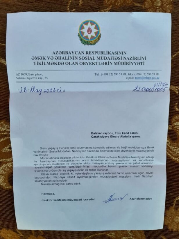 Elnarə Qarakişiyeva Əmək və Əhalinin Sosial Müdafiəsi Nazirliyinə də müraciət edib. Nazirliyin Tikilməkdə Olan Obyektlərin Müdiriyyəti tərəfindən ailəyə göndərilən məktubda qeyd olunub ki, qurum yalnız müharibə əlilləri və şəhid ailələrinin mənzil şəraitinin yaxşılaşdırılmasıyla məşğul olur. Vətəndaşların yaşayış evlərinin təmir olunması üçün nazirliyə büdcədən vəsait ayrılmır.