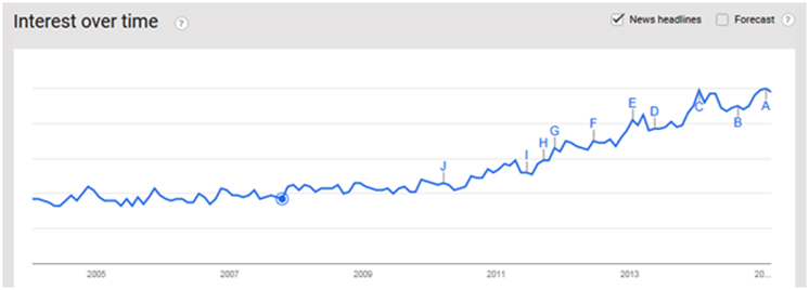 Vegeterianlıq bir həyat tərzi kimi son zamanların ən çox maraq duyurulan sahəsidir. Bunu Google Trends`dən izləmək olar. Belə ki sabiq ABŞ prezidenti Bill Klintonun vegeterian olduğunu açıqlaması, Justin Timbarlake`in “Bring it on down to Veganville” treki kimi nümunələr vegeterianlığa ola marağın birə-beş artmasına səbəb olmuşdur. Google Trends`ə görə toplumun vegeterian qidalanmya marağı görünməmiş həddə artmışdır. Aşağıdakı qrafik vegan sözünü axtaranların nə qədər artdığını göstərir. 2004-dən bəri ən yüksək göstərici – 100 rəqəmi bir neçə dəfə təkrarlanıb, hal-hazırda 2015 yanvar ayına olan göstərici də 100 sayını göstərir.