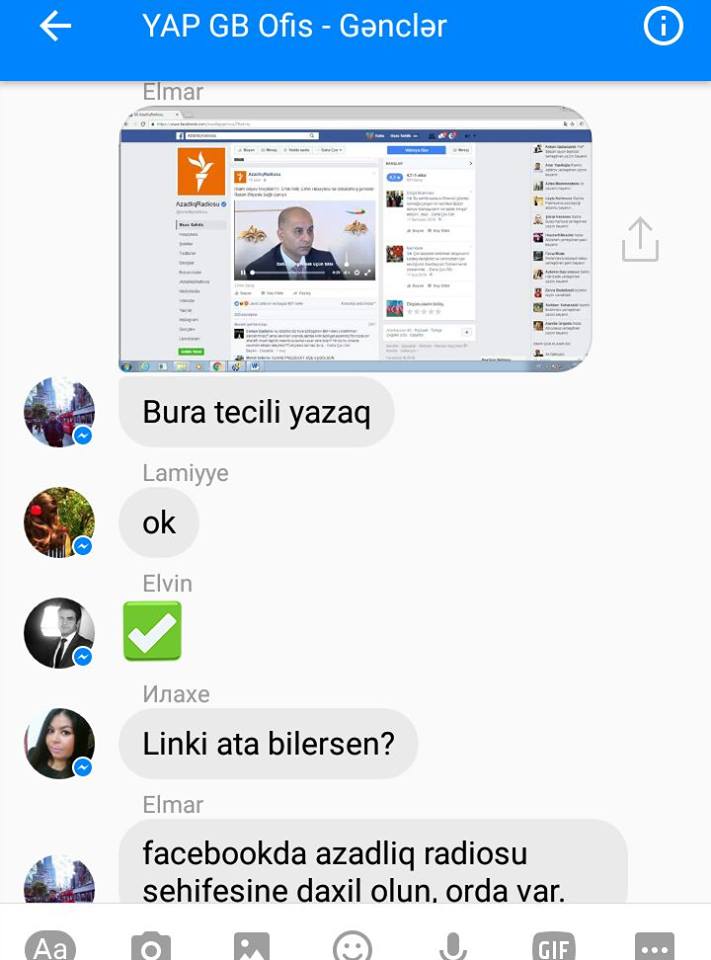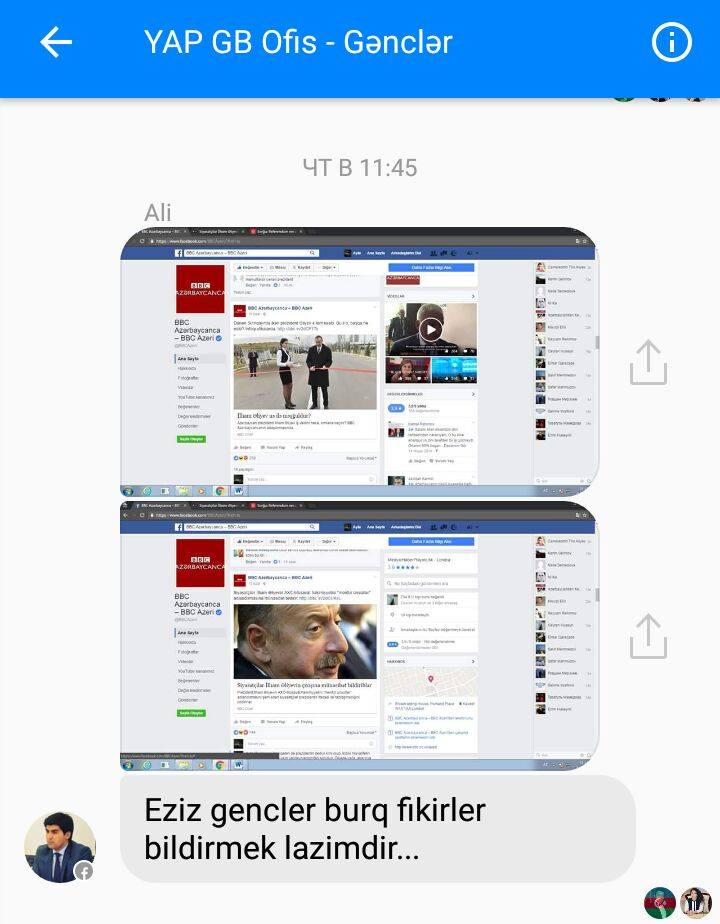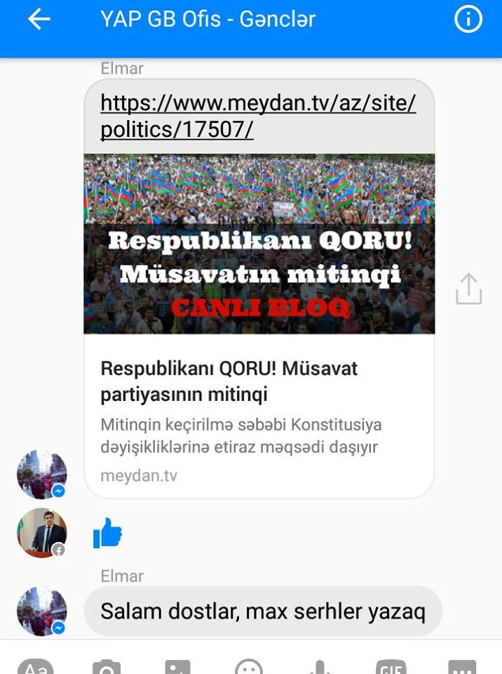Növbəti mesajında Elmar qrup üzvlərinə xəbərdarlıq edib ki, paylaşdıqları postlarda YAP (hakim partiyanın adının qısaldılmış formsı) sözünü yazmasınlar, yoxsa bunun təşkil olunmuş göstəriş olduğu üzə çıxacaq. Sonra o öz həmkarlarına daha çox rəy yazaraq Meydan TV-yə hücum etməyi tapşırıb.