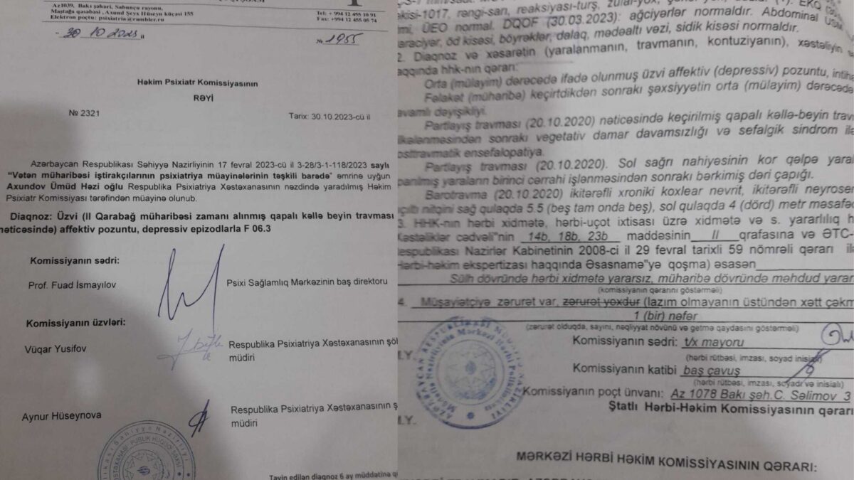 Meydan TV-yə müraciət edən Həzi Axundov bildirib ki, ailədə yeganə işləyən odur. Oğlu Ümid Axundov Qarabağ Müharibəsində döyüşlər zamanı yaralanıb, qapalı kəllə-beyin travması nəticəsində üstəlik əsəb xəstəliyinə tutulub. Maştağa qəsəbəsində yerləşən Ruhi-əsəb Xəstəxanasında müalicə alıb, hazırda müalicəsi müxtəlif xəstəxanalarda davam etdirilir. Onun dolanışığını, ehtiyaclarını da Həzi Axundov ödəyir. Bu səbəbdən işsiz qaldığı üçün çarəsiz vəziyyətdədir.
