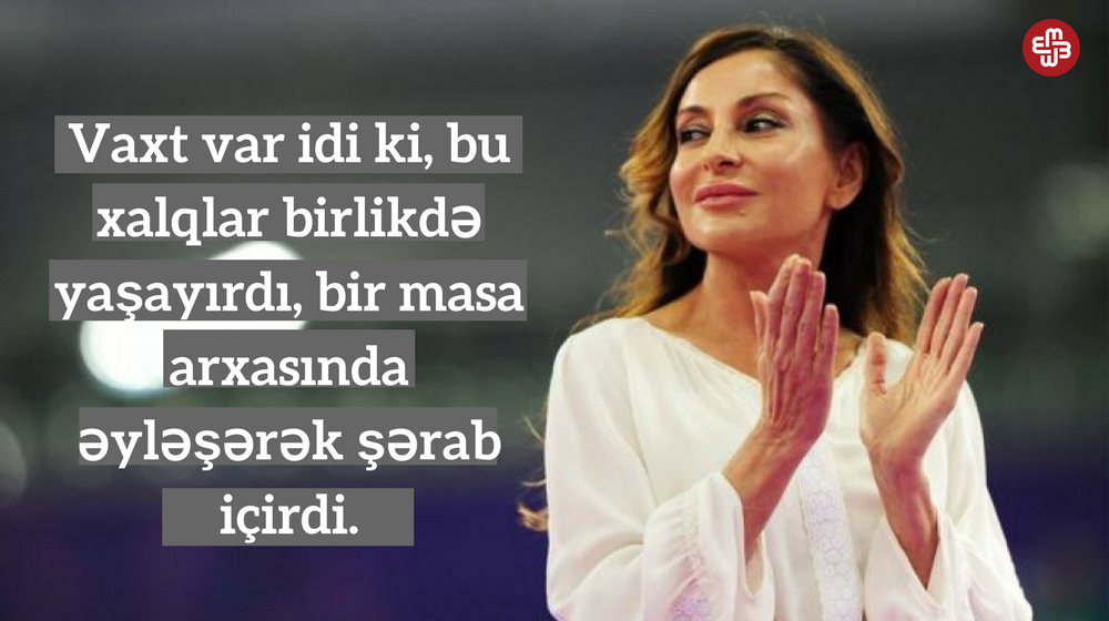 Xanım Əliyeva dedi ki, heç vaxt yol verməz ki, Azərbaycan xalqında ermənilərin timsalında düşmən obrazı formalaşsın. Vaxt var idi ki, bu xalqlar birlikdə yaşayırdı, bir masa arxasında əyləşərək şərab içirdi. Həmin zaman geri dönməlidir.