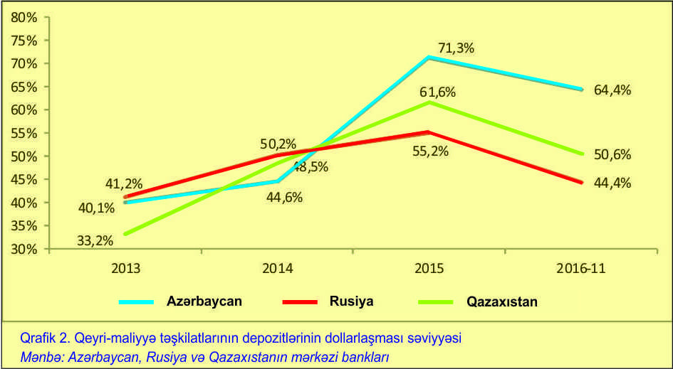 İqtisadçı deyir ki, Azərbaycan qeyri-maliyyə təşkilatlarının depozitlərinin dollarlaşması səviyyəsinə görə də digər iki ölkəyə uduzur. Rusiya və Qazaxıstan dollarlaşma səviyyəsini üzən məzənnəyə keçiddən əvvəlki səviyyəyə qədər azalda biliblər. Rusiyada müəssisələrin depozitlərində dollarlaşma səviyyəsi 2013-cü il, Qazaxıstanda isə 2014-cü il səviyyəsinə düşüb. Azərbaycanda azalma müşahidə edilsə də, hələ dollarlaşma yüksək səviyyədə qalmaqdadır.