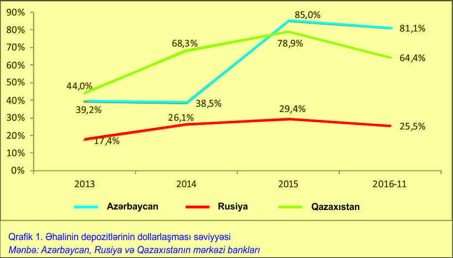 2013-cü ildə – neft gəlirlərinin yüksək səviyyədə olduğu bir dövrdə Rusiyada əmanətlərinin dollarlaşma səviyyəsi (17,4%) həm Qazaxıstan, həm də Azərbaycandan aşağı olub. Neftin kəskin ucuzlaşması və sanksiyaların Şimal qonşumuzda dollarlaşma səviyyəsini kəskin artıra bilməyib və bu səviyyə hətta 30%-dən də aşağı olub. Halbuki Azərbaycanda dollarlaşma səviyyəsi böhrandan əvvəl Qazaxıstandan az olsa da, böhran dövründə sürətli dollarlaşma nəticəsində manatın payı 15 faizə qədər azalıb”.