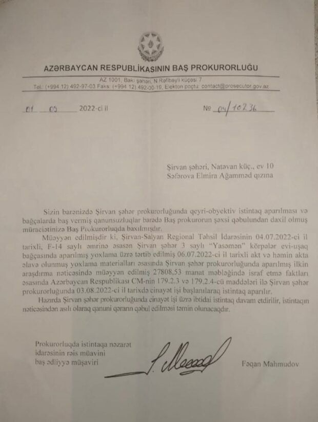 Prokurorluqda İstintaqa Nəzarət İdarəsinin rəis müavini Fəqan Mahmudov keçmiş bağça müdirinin onun haqqında Şirvan Şəhər Prokurorluğunda araşdırmaların obyektiv aparılmaması, qərəzli olması haqda şikayətinə cavab verib. O bildirib ki, Şirvan-Salyan Regional Təhsil İdarəsinin 4 iyul 2022-ci il tarixli əmrinə əsasən, “Yasəmən” uşaq bağçasında yoxlama aparılıb və akt tərtib edilib. Həmin akta əlavə edilmiş yoxlama materialları əsasında Şirvan Şəhər Prokurorluğunda ilkin araşdırma gedib. Nəticədə 27 min 808 manat israfetmə müəyyənləşdirilib. Bu faktlar əsasında da Cinayət Məcəlləsinin 179.2.3 və 179.2.4 maddələrilə 3 avqust 2022-ci ildə cinayət işi başlanıb: