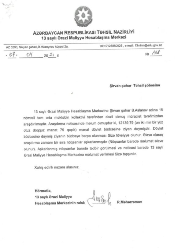 “Bağçanın tərbiyəçisi Vüsalə Əhmədovanın həm mənim, həm də bağçanın kollektivindən yazdığı şər-böhtanlarından, ona himayədarlıq edən Şirvan-Salyan Regional Təhsil İdarəsinin müdir müavini Rövşən Allahverdiyevin (Şirvan Şəhər Təhsil Şöbəsinin keçmiş müdiri-red.) əlindən boğaza yığılmışam. Rövşən Allahverdiyevin, Şirvan Şəhər İcra Hakimiyyətinin maliyyə sektorunun müdiri Həzi Qasımovun əməllərindən bağça və məktəblərdə nə qədər əziyyət çəkən var. Təsəvvür edin, heç bir rəsmi əmr, Təhsil Nazirliyinin razılığı olmadan, 13 saylı məktəbin direktoru Aynurə Rzayeva eyni zamanda, 16 saylı məktəbin direktoru vəzifəsini də faktiki icra edib. Həmin dövrdə bütün maliyyə- təsərrüfat sənədlərinə imza atıb. Vaxtilə bu məsələ ilə əlaqədar müəyyən orqanlar yoxlama apardı. Lakin nə məsələdirsə, himayədarları sayəsində ört-basdır edildi. Səbəb də budur ki, həmin direktor Aynurə Rzayeva Şirvan şəhərinin icra başçısının müavini Məharət Mustafayevin baldızıdır”.