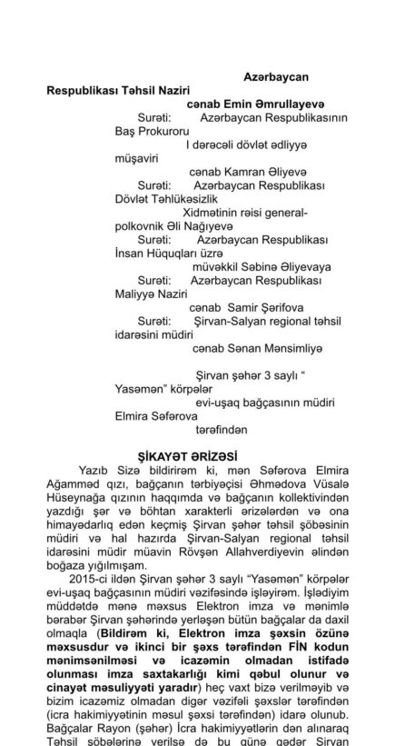 Şirvan şəhərindəki 3 nömrəli “Yasəmən” körpələr evi-uşaq bağçasının keçmiş müdiri Elmira Səfərova deyir ki, onu şikayət etdiyinə görə cəzalandırırlar. Söhbət Şirvandakı uşaq bağçalarında, məktəbdə baş verən qanunsuzluqlardan və bu özbaşınalıqlara yol verən şəxsləri himayə edən məmurlarla bağlı şikayətlərdən gedir.