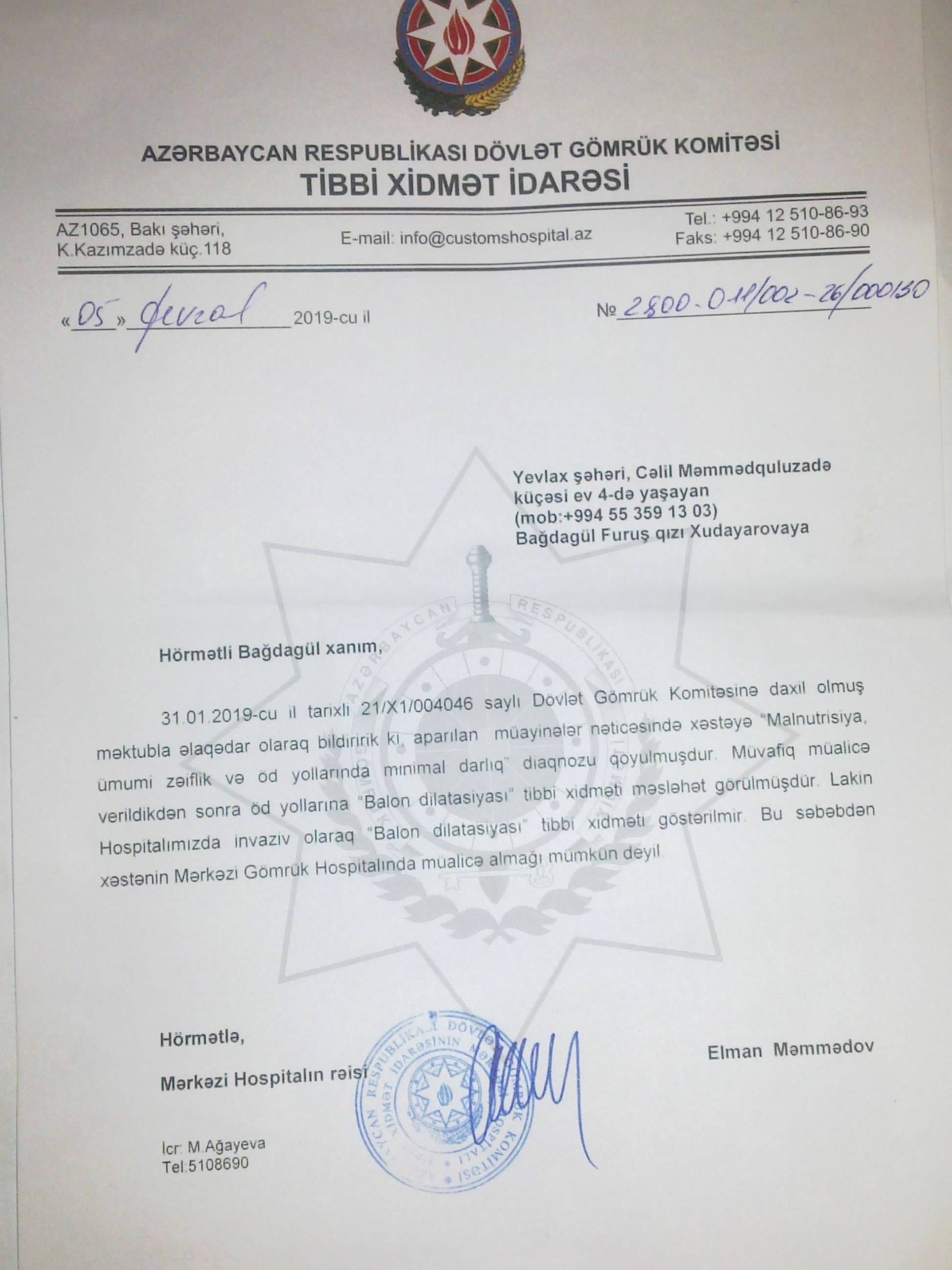 “Aparılan müayinələr nəticəsində xəstəyə “Malnutrisiya, ümumi zəiflik və öd yollarında minimal darlıq diaqnozu qoyulub. Müvafiq müalicə verildikdən sonra öd yollarına “balon dilatasiyası” tibbi xidməti məsləhət görülüb. Lakin hospitalda bu tibbi xidmət göstərilmir. Bu səbəbdən də xəstənin Gömrük Hospitalında müalicə alması mümkün deyil”.