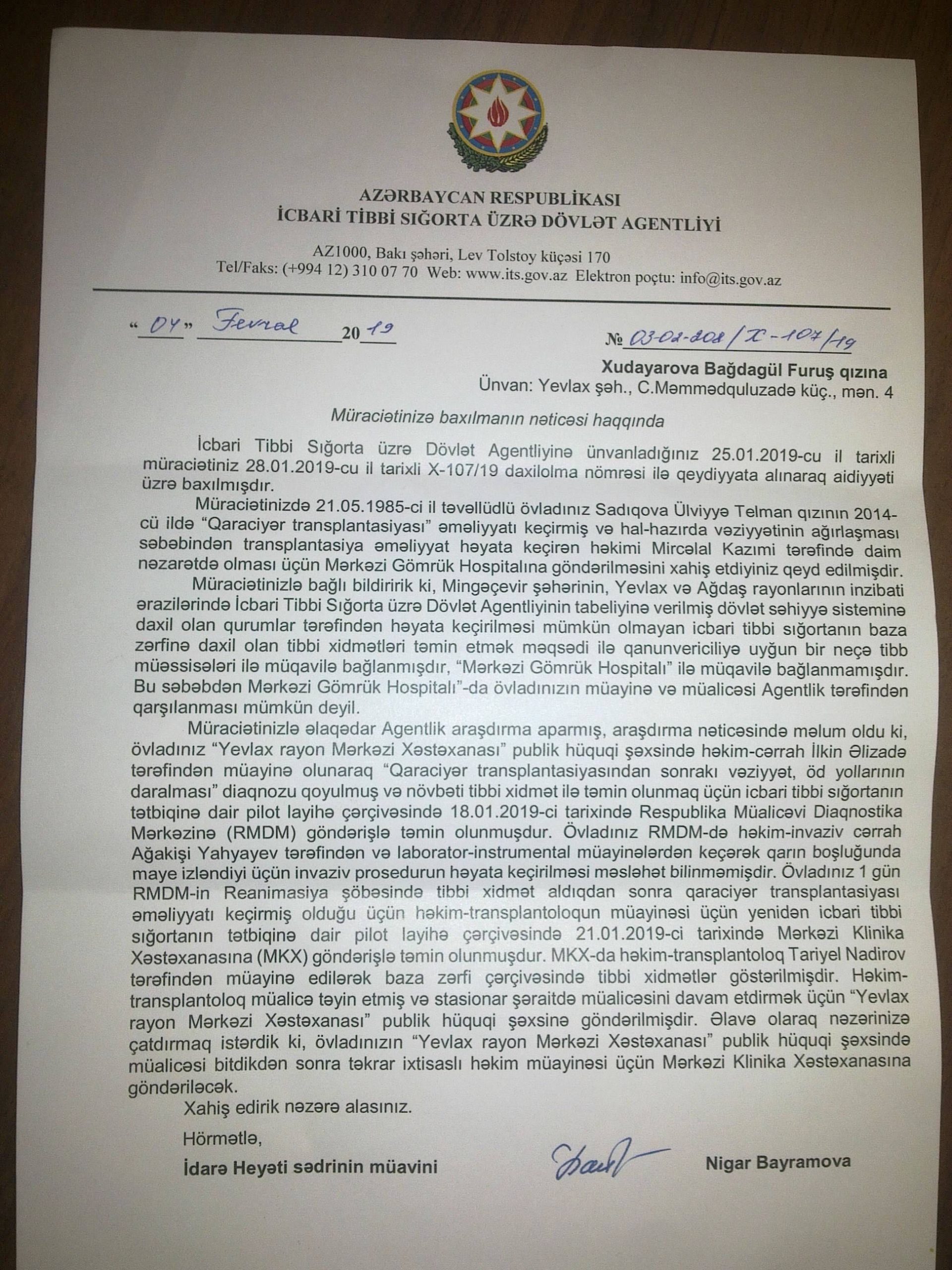 Xəstənin ailəsi də əməliyyatın keçirildiyi Gömrük Hospitalına müraciət edib. Ancaq bu il fevralın 5-də ailəyə məktubla bildirilib ki, xəstənin müalicəsi bu xəstəxanada mümkün deyil: