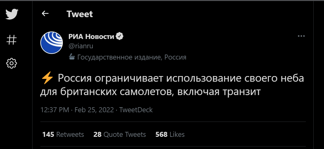 “Ria Novosti” yazır ki, Rusiya tranzit də daxil olmaqla bütün Britaniya uçuşları üçün öz hava məkanından istifadəni məhdudlaşdırır.