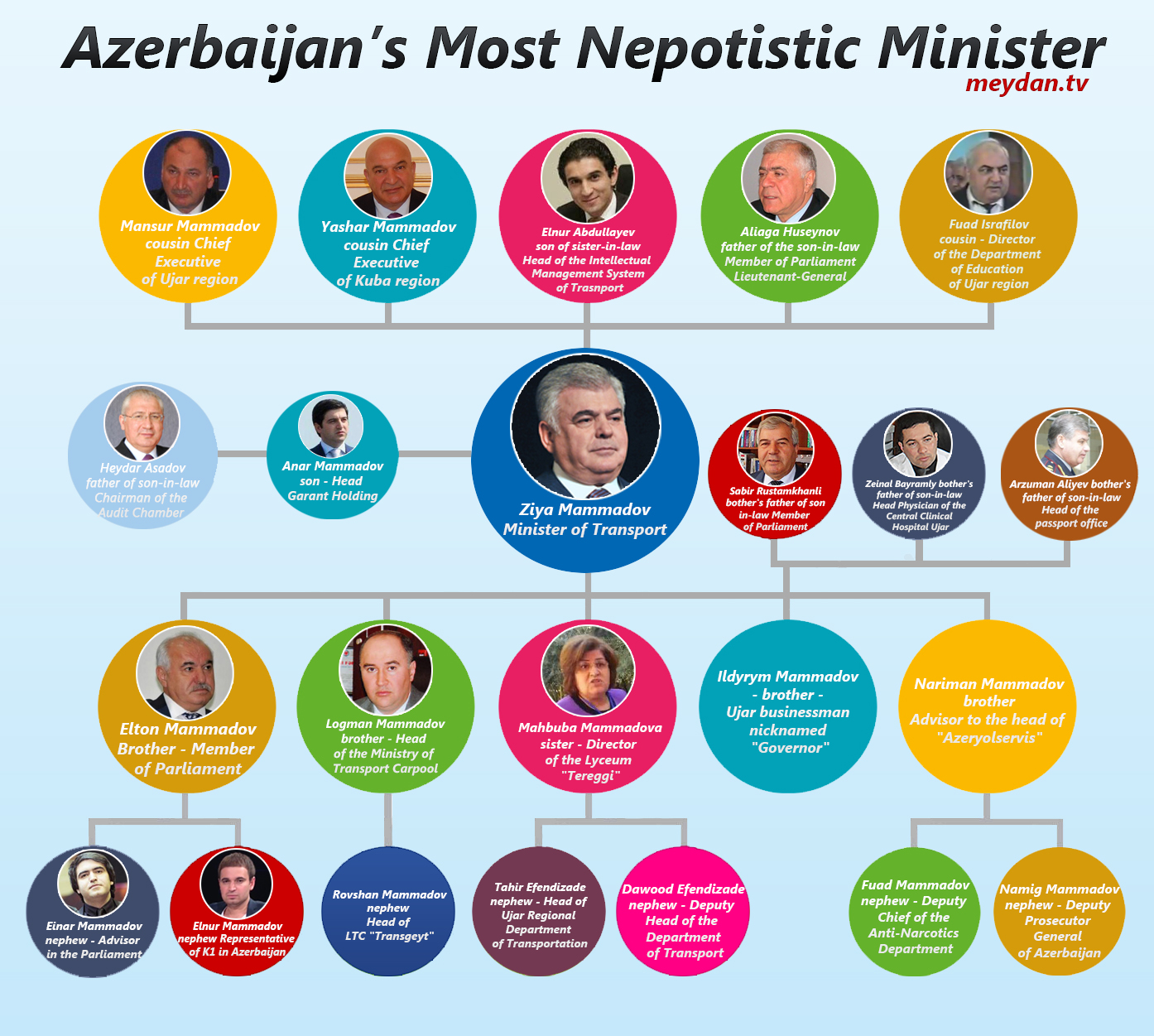 In Azerbaijan, the violation of laws through the noncompliance of officials has become commonplace. At the international level, legal conventions are similarly ignored; according to the UN Convention on Corruption, nepotism is considered a kind of corruption, requiring punitive action. In Azerbaijan it is also considered an abuse of power to appoint one’s relatives to government positions, and is forbidden by law, yet government officials ignore this. There is one minister in particular who ignores this law, even beating President Ilham Aliyev in the number of relatives appointed to government positions. This minister is Ziya Mammadov, Minister of Transportation.