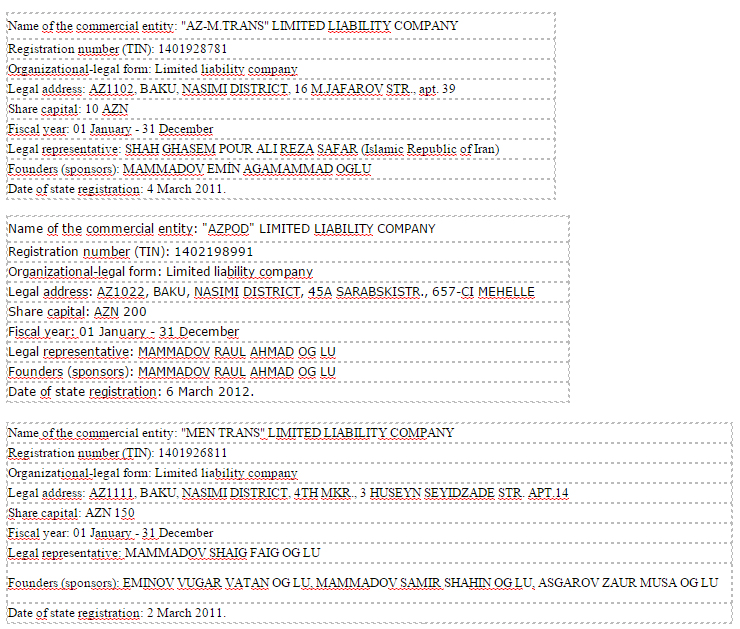 It has been suggested that “MEN trans” company informally belongs to Namig Mammadov, and that the abbreviation in the company’s name stands for Mammadov Elgun Namig oghlu. The second company that took part in road construction projects with precurement of asphalt-pressing machines, sand, gravel and other material-carrying vehicles is an “Azpod” company.