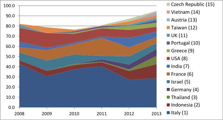 According to the reports of the Azerbaijan State Statistical Committee, Italy whose import share in 2008 was 43% dropped to 28,7% by 2013, while indicators for Indonesia grew from 3.2% in 2008 to 13,7% in 2013. Similar to Indonesia, other countries with growing interest in Azerbaijani oil in 2013 were Thailand (8.2%), India (5.4%), Taiwan (2.3%), Vietnam (1.4%) and Malaysia indicating growing imports especially in the past four years.