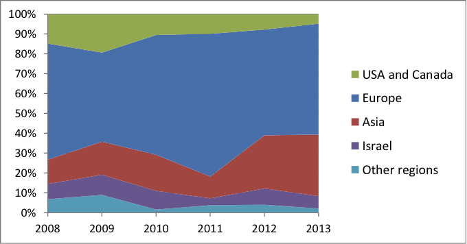 However, while exports to some countries grew, to others they have declined. The most notable of these are Israel, France and the US. In 2008, US imported 13,5% of Azerbaijani oil but by 2013, the imports dropped to 4.8%. Despite oil exports growing from 5.2% to 17.6% with France at some point, in the course of the next years it dropped to 5.6%. The same tendency exist with Israel where oil imports dropped from 7.7% in 2008 to 6.2% in the following years.
