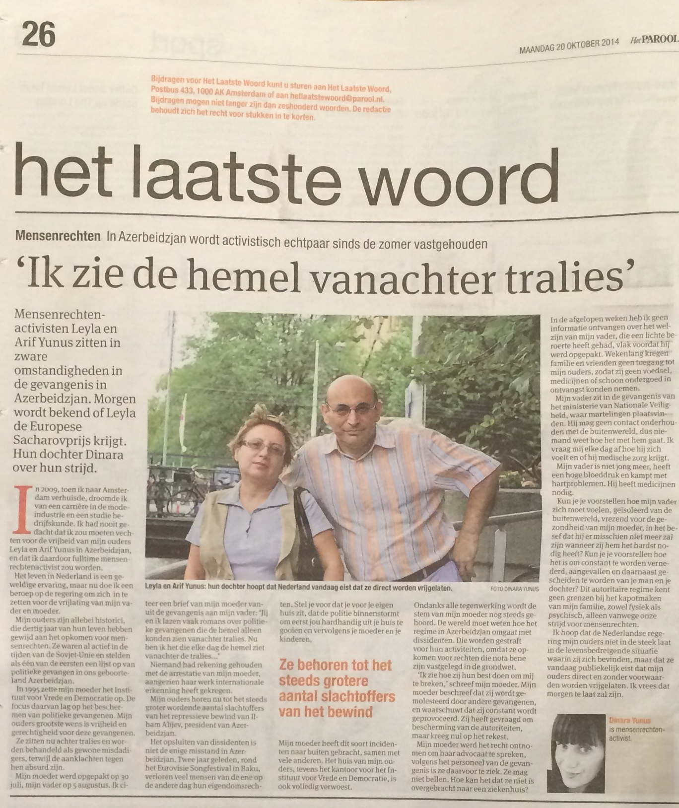 Dinara Yunus, daughter of Leyla and Arif Yunus recently wrote for the Dutch Press calling on the Dutch government not to stay ignorant and call for her parents immediate release.