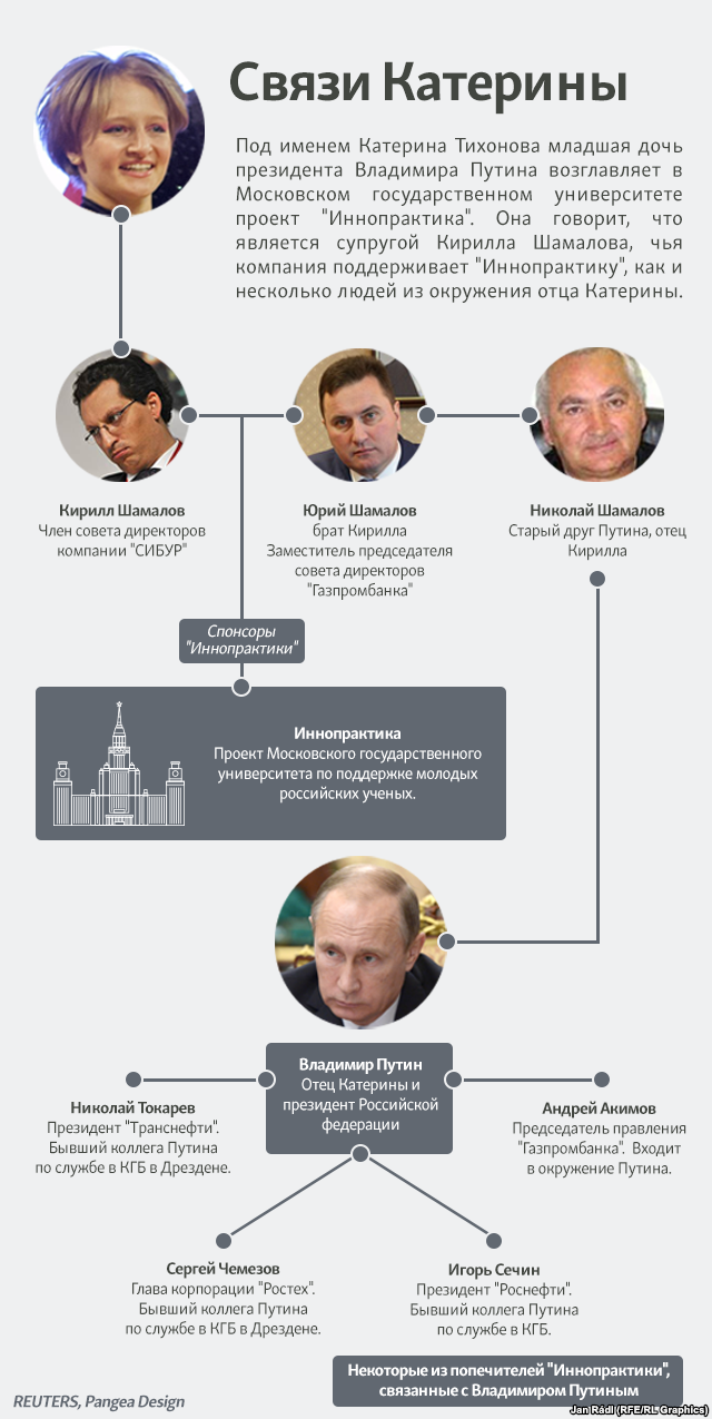 Андрей Акимов, председатель правления «Газпромбанка», сообщил корреспонденту Reuters, что встречался с Катериной, которой сейчас 29 лет, еще когда она была ребенком. Видел он ее и в менее отдаленные времена. По словам Акимова, Катерина живет под фамилией Тихонова (ее идентичность уже не раз обсуждалась в СМИ и социльных сетях – РС). Катерина называет себя супругой Кирилла Шамалова, сына Николая Шамалова, давнего друга президента Путина. Шамалов-старший – акционер банка «Россия», который американские власти считают банком российской элиты.