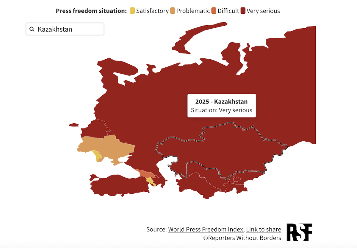 Казахстан – не единственная, конечно, страна центральноазиатского региона, где свобода слова не является общественным достоянием. Если посмотреть Всемирный индекс свободы прессы за 2025 год, составленный международной организацией «Репортеры без границ» (RSF) и опубликованный в мае 2025 года, то ситуация со свободой слова в странах ЦА там характеризуется не иначе, как «медленное экономическое удушение независимой прессы».