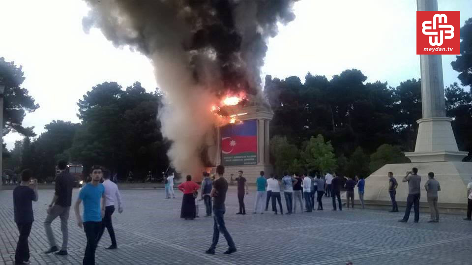5 июня в городе Сумгаит на Площади Флага сгорел стенд с фотографией покойного президента Азербайджана, Гейдара Алиева.